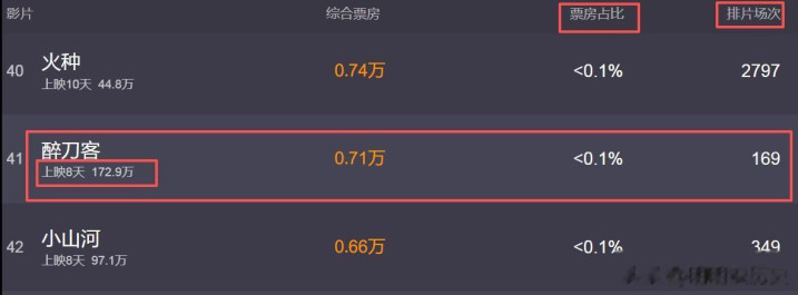 为啥输得这么惨呢?先说排片这事儿哈。10月25号那天,《醉刀客》在全国就排了169场,可同期的《火种》呢,排了2797场,这差距差不多有20倍呢。